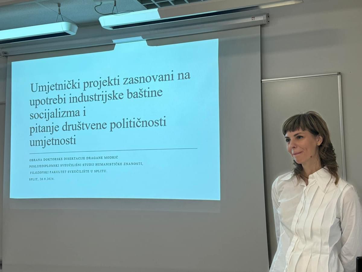 Doktorandica Filozofskog fakulteta u Splitu Dragana Modrić obranila je dana 26. rujna 2024. godine u 12.00 sati na Filozofskom fakultetu u Splitu doktorski rad na temu Umjetnički projekti zasnovani na upotrebi industrijske baštine socijalizma i pitanje društvene političnosti umjetnosti /Artistic projects based on the use of the industrial heritage o fsocialism and the question of social politicity of art.