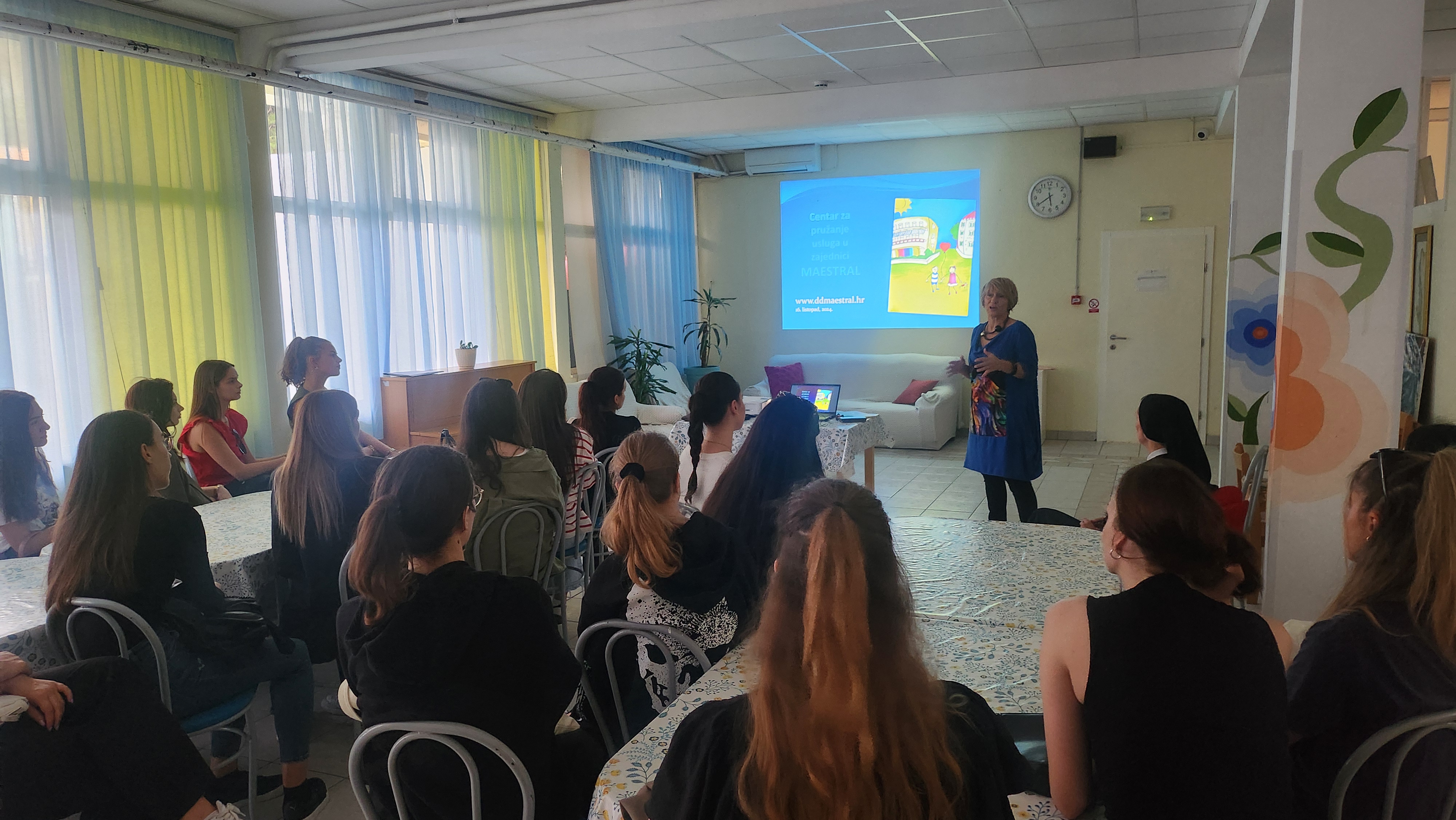 U okviru kolegija Domska pedagogija, studenti pedagogije Filozofskog fakulteta su posjetili Centar za pružanje usluga u zajednici Maestral sa profesoricama dr. sc. Marijanom Ćuk i izv. prof. dr. sc. Ines Blažević. Rad Centra Maestral predstavila nam je voditeljica odgajateljica gđa Anita Jaman, prof.. Upoznala je studente s misijom i vizijom te cjelokupnim djelovanjem Maestrala. Obišli smo prostorije Maestrala, ali i bili u prilici susresti same korisnike. Posebno je bilo dirljivo razgovarati o odgajateljskim iskustvima sa samim korisnicima kao i pedagoškim smjernicama i preporukama budućim odgojno-obrazovnim djelatnicima. Zahvaljujemo ravnateljici gđi Jeleni Burazin koja je omogućila posjet, kao i svim djelatnicima Maestrala, a posebice njegovim korisnicima koji su pripremili predivni plakat dobrodošlice svojim gostima.