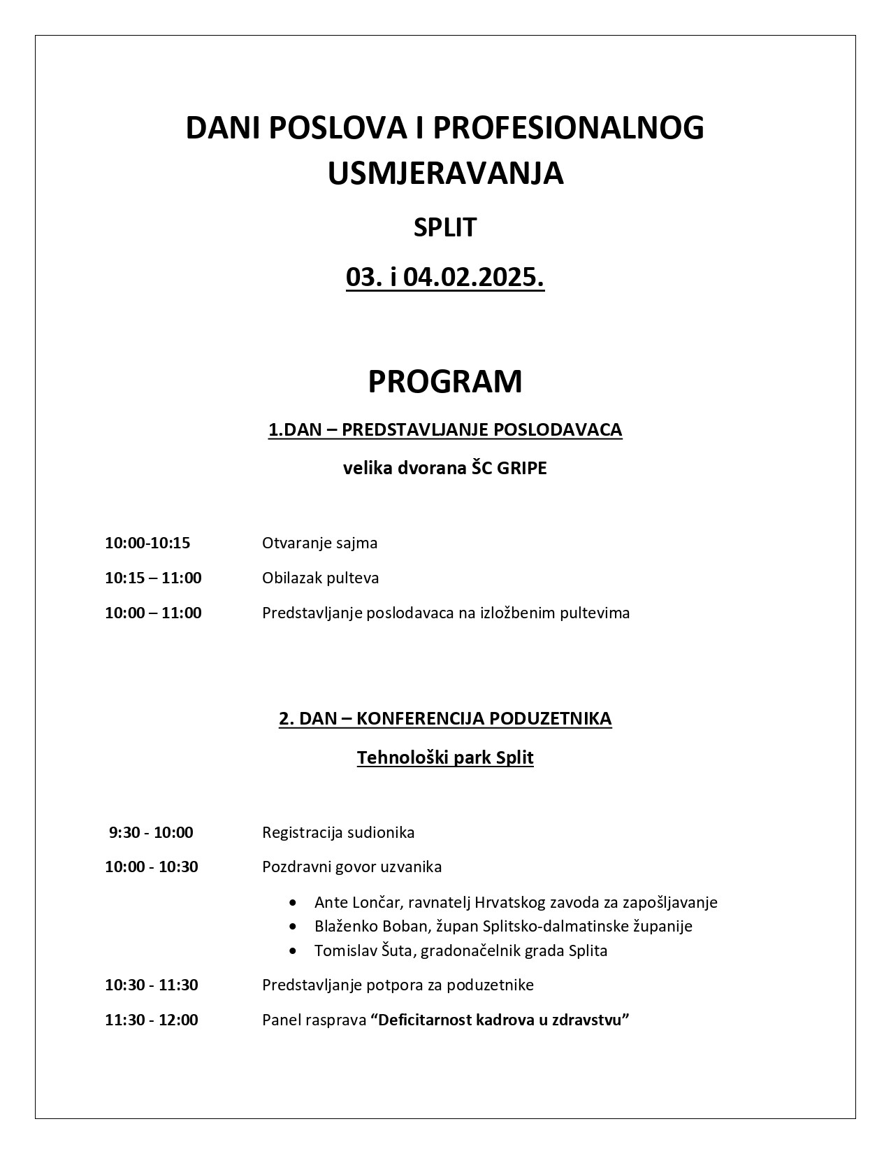 Ovo dvodnevno događanje uključuje Sajam poslova (3. veljače u velikoj dvorani ŠC Gripe, od 10 do 14 sati) te Konferenciju za poduzetnike.