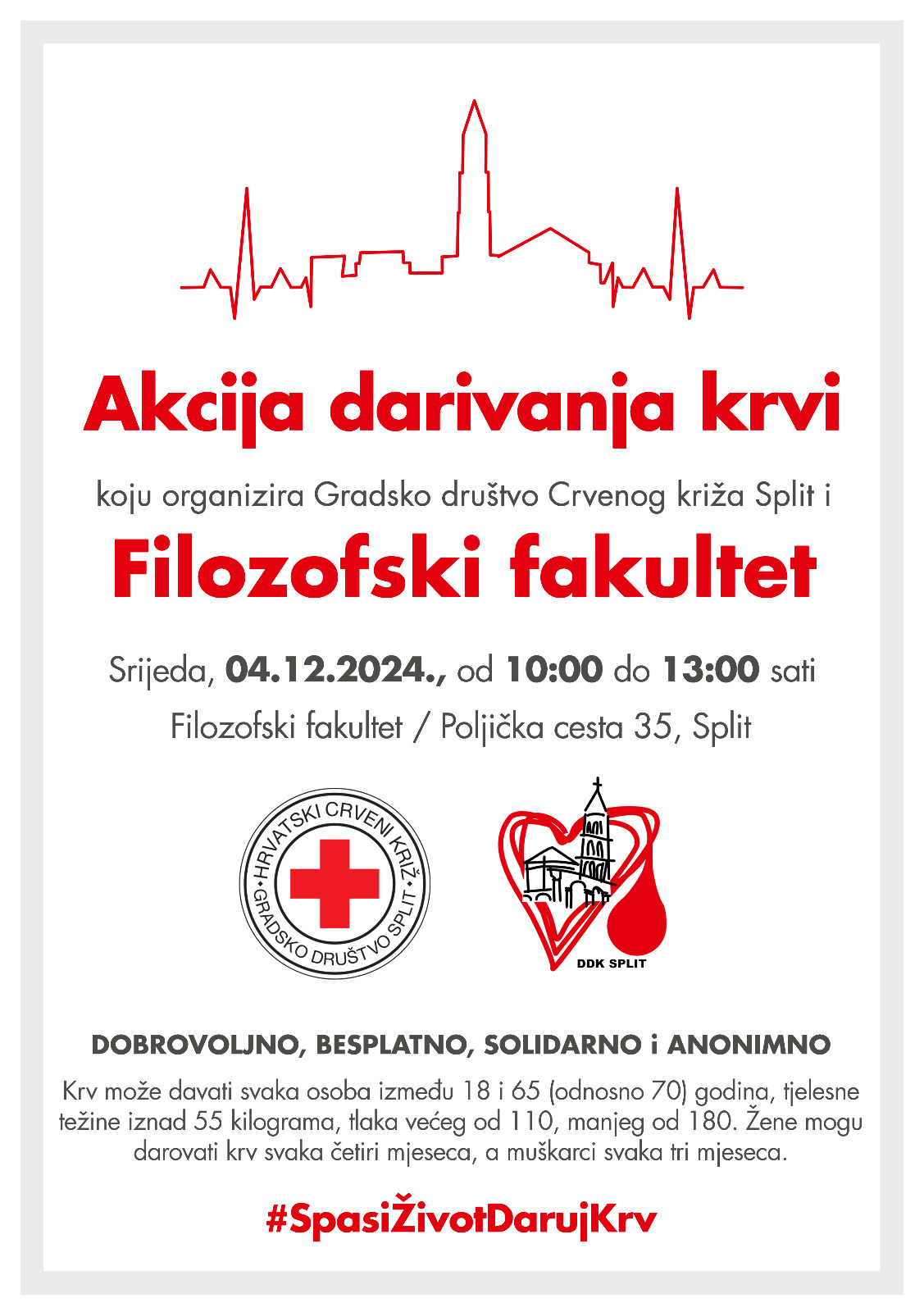 U organizaciji Gradskog društva Crvenog križa Split, Filozofskog fakulteta u Splitu i Udruge bivših studenata i prijatelja Filozofskog fakulteta u Splitu održana je akcija dobrovoljnog darivanja krvi.