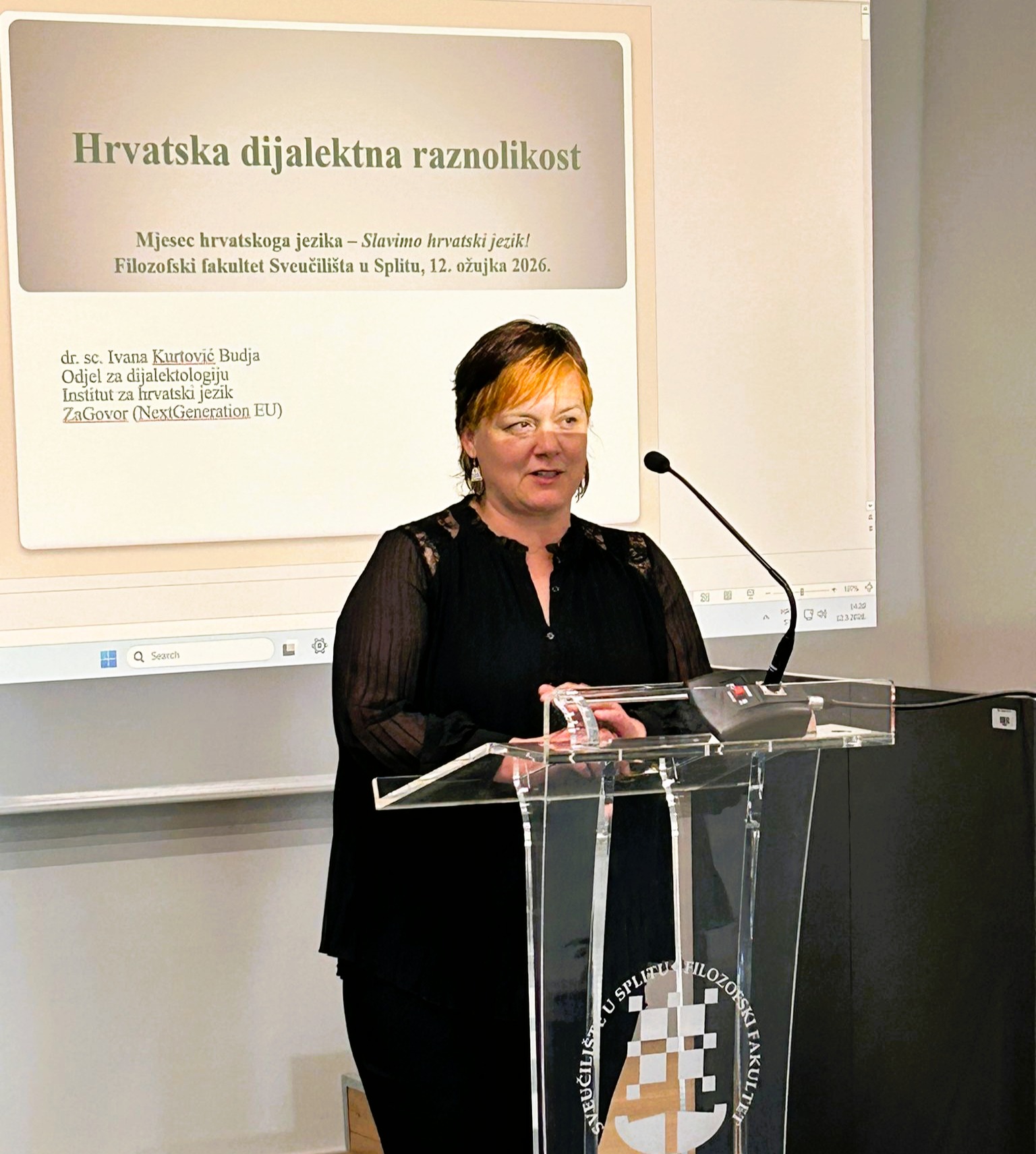 Dana 12. ožujka 2026. u Dvorani Marka Marulića dr. sc. Ivana Kurtović Budja, viša znanstvena savjetnica na Institutu za hrvatski jezik u Zagrebu, održala je predavanje Hrvatska dijalektna raznolikost.