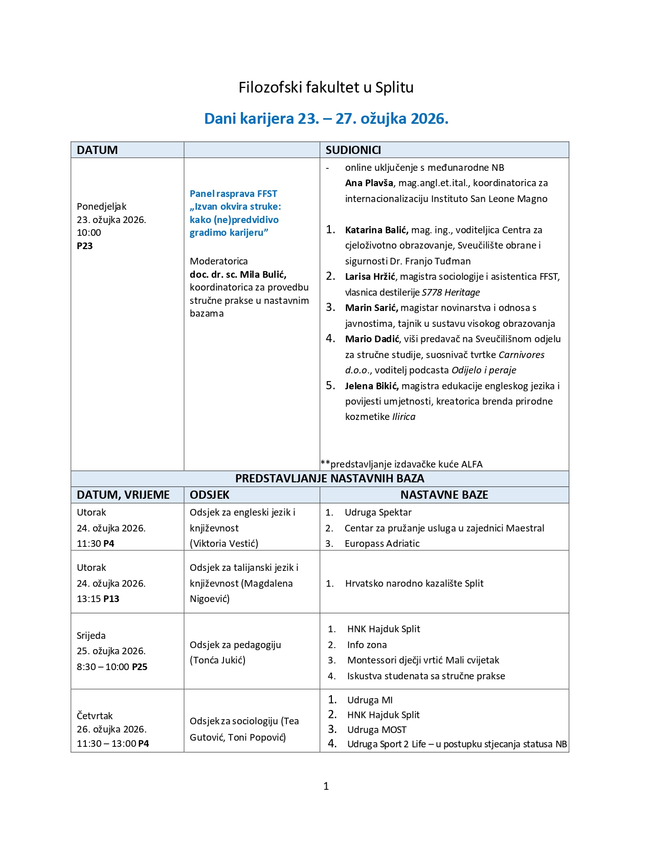 Filozofski fakultet u Splitu organizira Dane karijera, koji će se održati od 23. do 27. ožujka 2026. godine. Program priprema Centar za planiranje i razvoj karijera Filozofskog fakulteta u Splitu u suradnji s nastavnim bazama Fakulteta, s ciljem povezivanja studenata s poslodavcima, nastavnim bazama i stručnjacima iz različitih područja.