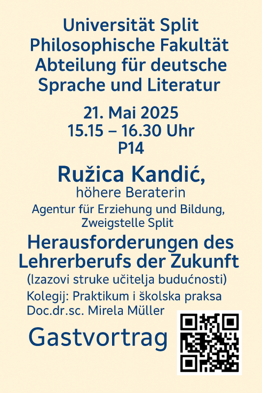 Gostujuće predavanje više savjetnice  Ružice Kandić  iz  Agencije za odgoj i obrazovanje, podružnica Split  održat će se  21. svibnja 2025.  u vremenu od  15.15 do 16.30 sati .