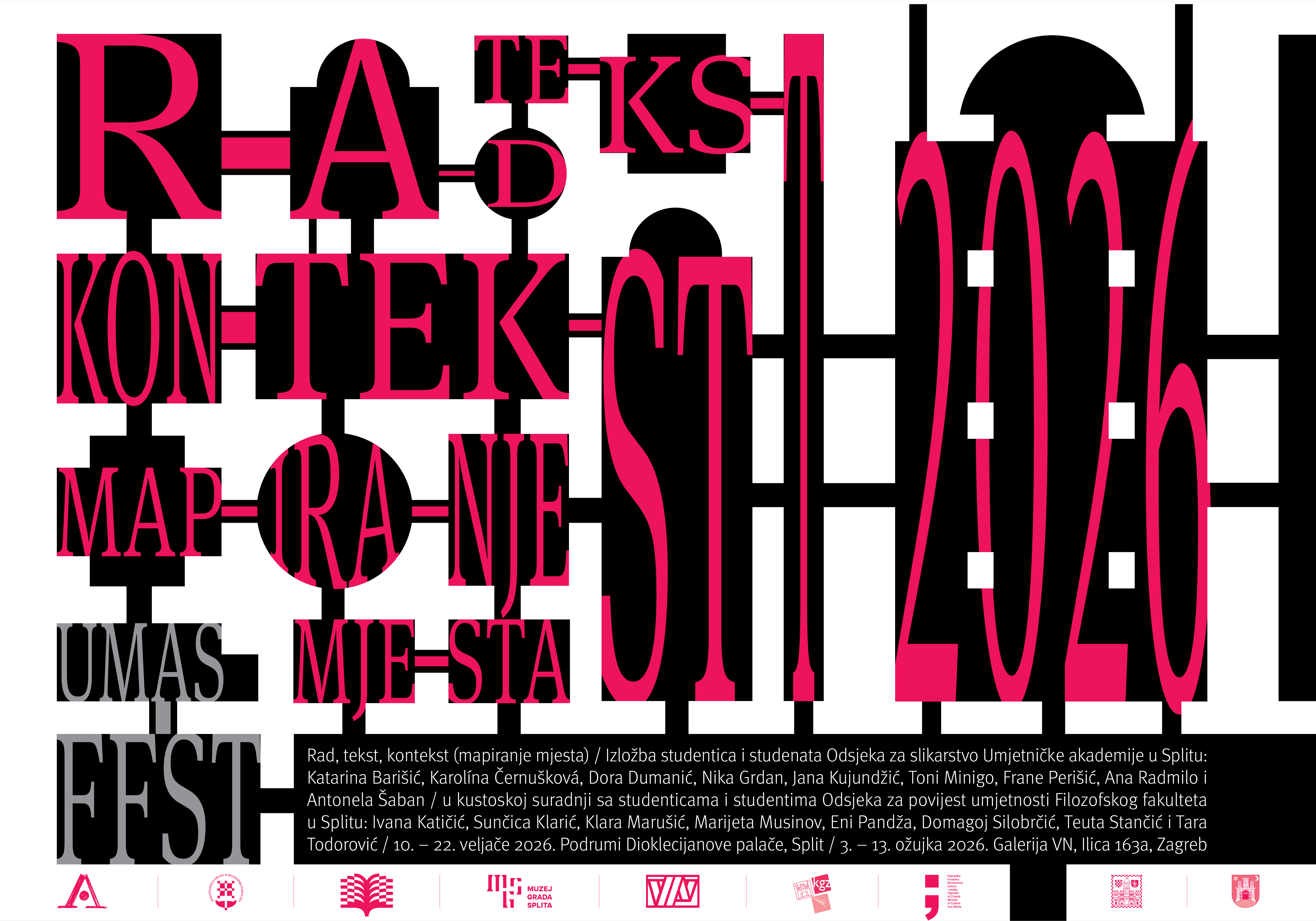 U Podrumima Dioklecijanove palače u Splitu od 10. do 22. veljače 2026. godine održava se izložba “Rad, tekst, kontekst (mapiranje mjesta)”, kao peto izdanje kolaborativnog projekta studenata Odsjeka za slikarstvo Umjetničke akademije u Splitu i studenata Odsjeka za povijest umjetnosti Filozofskog fakulteta u Splitu.